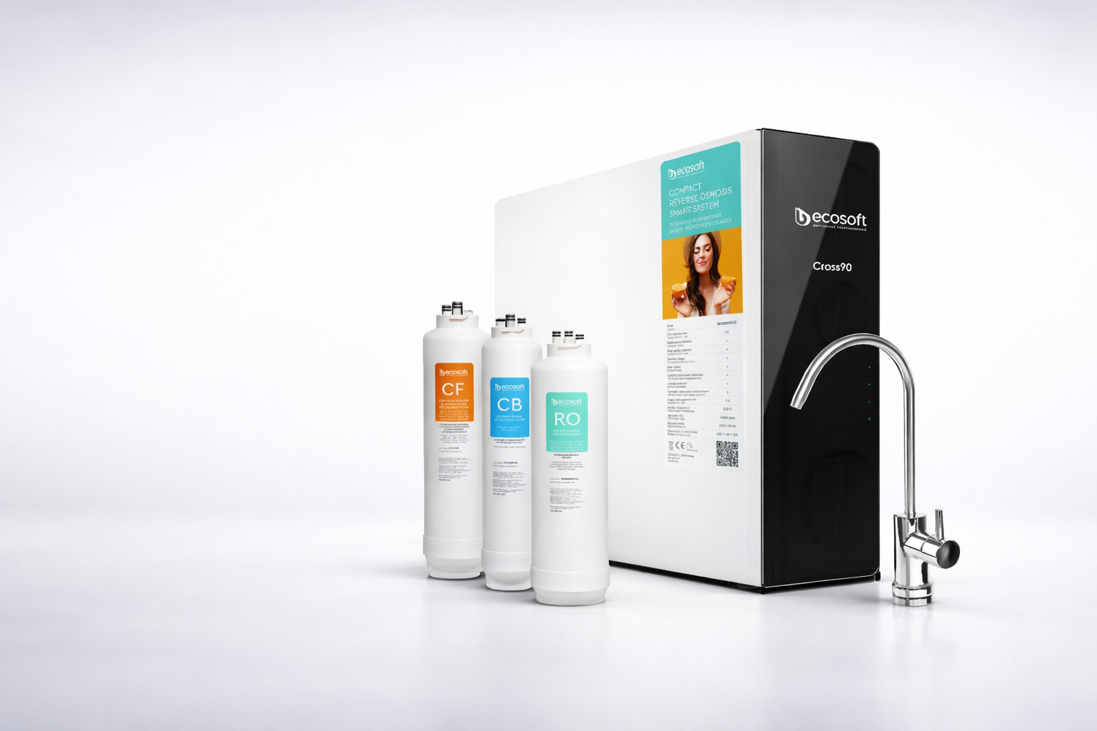 Ecosoft CROSS 90 filter z direktno reverzno osmozo je visokozmogljiv sistem za čiščenje vode, ki zagotavlja do 90 l/h čiste in varne pitne vode brez potrebe po zalogovniku. Njegova kompaktna zasnova z direktnim tokom in 4-stopenjskim čiščenjem odstrani do 99,8 % perfluoriranih maščobnih kislin (PFAS), klora, bakterij, težkih kovin in vodnega kamna. S stopnjo predelave do 60 % poveča učinkovitost z zmanjšanjem odpadne vode. Pametno samodejno splakovanje zagotavlja stabilno delovanje in popolnoma svežo vodo že od prvega kozarca. Vgrajeni LED indikator menjave filtra in zaščita pred puščanjem v kombinaciji s pametno pipo zagotavljata nadzor v realnem času in brezskrbnost.