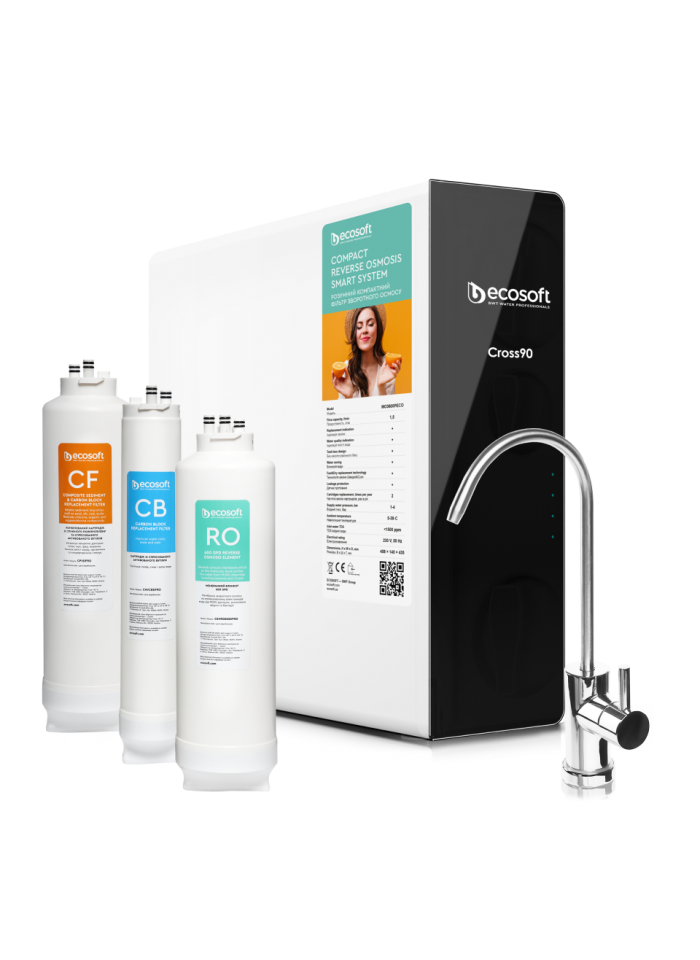 Ecosoft CROSS 90 filter z direktno reverzno osmozo je visokozmogljiv sistem za čiščenje vode, ki zagotavlja do 90 l/h čiste in varne pitne vode brez potrebe po zalogovniku. Njegova kompaktna zasnova z direktnim tokom in 4-stopenjskim čiščenjem odstrani do 99,8 % perfluoriranih maščobnih kislin (PFAS), klora, bakterij, težkih kovin in vodnega kamna. S stopnjo predelave do 60 % poveča učinkovitost z zmanjšanjem odpadne vode. Pametno samodejno splakovanje zagotavlja stabilno delovanje in popolnoma svežo vodo že od prvega kozarca. Vgrajeni LED indikator menjave filtra in zaščita pred puščanjem v kombinaciji s pametno pipo zagotavljata nadzor v realnem času in brezskrbnost.
